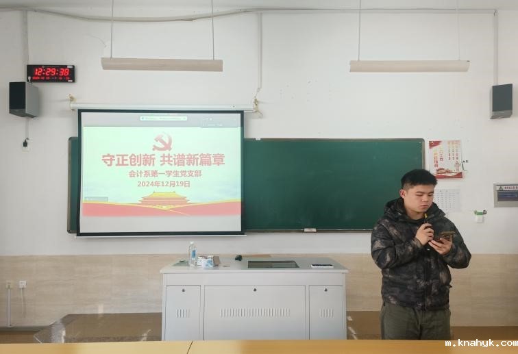 为深入学习贯彻习近平总书记重要讲话精神,更好动员广大青年牢记嘱托,2024年12月19日12时30分,会计系第一学生党支部于教室7-304开展“守正创新,共谱新篇章”主题党日。本次主题党日以“认真学习贯彻习近平总书记近期重要讲话和重要指示精神,做好2025深化教育改革相关工作规划”为第一议题,并由会计系第一学生党支部书记厉万荣进行领学,严煜晨同志主持,戚家阳、陈诺怡和柯青青等同志担任主讲,以下是三位同志的分享。