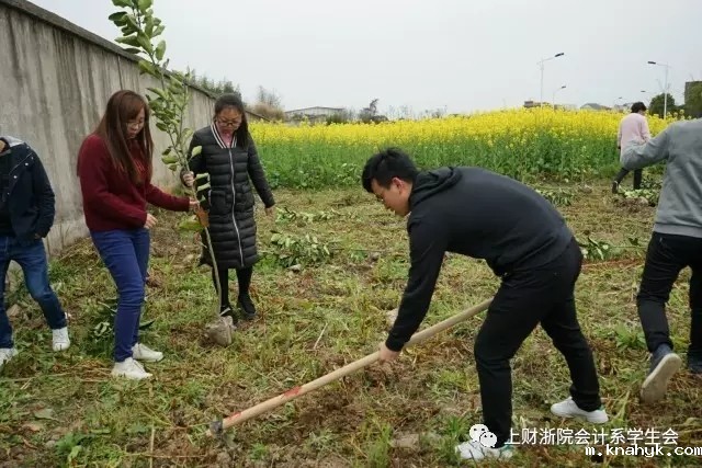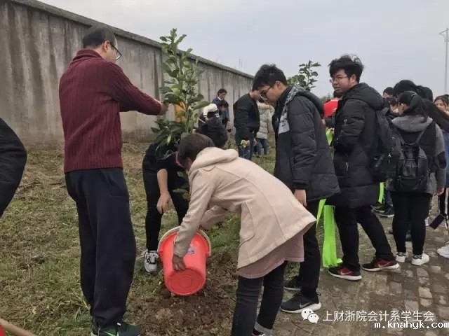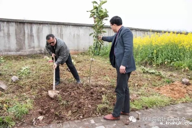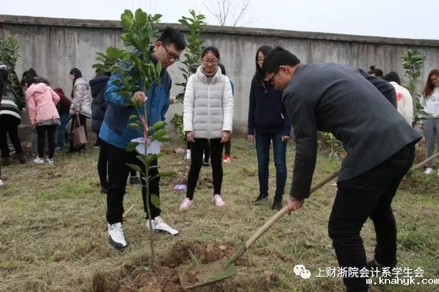 活动实行“一班一树”制,即每班种树一棵。首先,会计系学生会青年志愿者部组织各班班主任带领学生种植苗。植树现场,同学们有的拿起铁锹,锄头开始埋头挖坑,有的则挥锹铲土、扶树填土、培土浇水,大家互相配合,忙得不亦乐乎。经过一个多小时的劳作,45棵柚子新苗在绿化带“安家落户”。